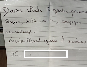 Une petite supérette dans un bourg normand, près du Havre. Sous le comptoir, cette feuille scotchée, genre vieux papier courrier. Le message est bref. Je vois votre sourire au coin des lèvres. Un raccourci immédiat : ou un vieux ou une bête ? Non, pas des équivalents. Car le premier est préféré au second. Cela aurait pu être l’inverse : cherche garde d’animaux, éventuellement personnes âgées. Il faut donc bien lire : à défaut. À défaut de personnes âgées…