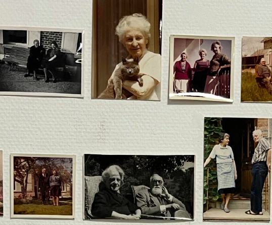 Sur un mur, sur une ligne horizontale, sont présentées des photos noir et blanc petit format qui ont vraisemblablement été prises par des photographes ambulants dans les années 1930-1940.