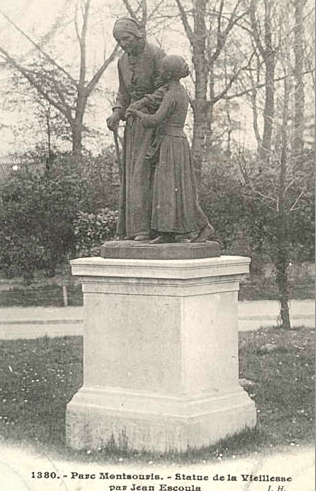 On découvre que son artiste est Jean Escoula, apprenti chez son père marbrier jusqu’à 20 ans, dix-sept fois exposé au Salon des artistes français de 1876 à 1908, médaille d’or aux Expositions universelles 1889 et 1900, montré à la SNBA de 1892 à 1910. On découvre aussi qu’il fut praticien pour Rodin – de 1884 à 1900, il taille « La Danaïde », « Ève », et « L’Éternelle idole ». « Le Bâton de vieillesse » de Jean Escoula fut réalisé avant sa collaboration avec Rodin, sa version en terre cuite fut primée au Salon de 1882 et achetée par la ville de Paris… La sculpture en bronze est inaugurée en 1889, et vient enrichir le riche statuaire du parc… Montsouris où les promeneurs peuvent l’admirer un demi-siècle. Car « La vieillesse », c’est le nom qu’on lui donne, est fondue comme bon nombre d’autres sculptures urbaines sous le régime de Vichy.