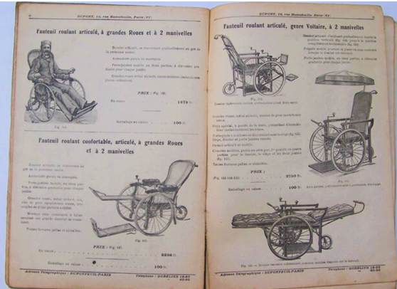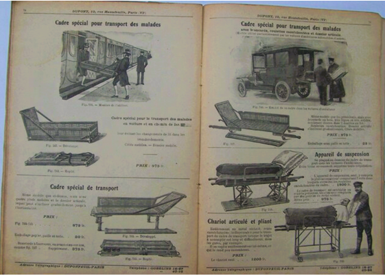 À la consultation du catalogue illustré de la société Vve Dupont & André Dupont, successeurs, qui propose « Lits, fauteuils, voitures et appareils mécaniques », on sera étonné de voir que dès le début du siècle, de nombreuses innovations en la matière existent. La guerre a développé un commerce mais tout était déjà là. De la « canne en bois noir » au « fauteuil Bijou à grandes roues », jusqu’à la « Voiture mue par l’électricité », on a inventé pour ceux et celles qui avait du mal à marcher, du blessé occasionnel à « l’infirme » et au « vieillard », une gamme très sophistiquée de dispositifs, jusqu’aux « Ambulances automobiles Dupont pour le transport des malades, blessés et convalescents dans Paris, en Province et à l’étranger ». Petites listes pour tous les maux mais aussi toutes bourses.